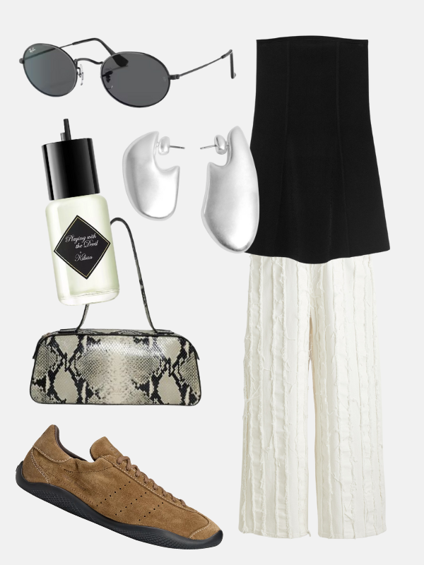 Mango crni top bez bretela pravi kontrast sa belim farmerkama koji je grafički i čist. Khaite tašna sa zmijskim dezenom dodaje dramu dok Ray-Ban crne okrugle naočare kriju pogled dok prolazi gradom posle zalaska. Njen Kilian parfem ostavlja trag. Cos asimetrične srebrne minđuše love svetlo. Nove Adidas x Wales Bonner antilop patike daju joj ritam, a ona ide na kasno piće, možda i đusku bez plana.