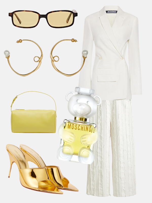 Belo, zlatno i dodir žute za zalazak i prvi dejt. Jacquemus sako i bele farmerke daju čistu liniju, Massimo Dutti naočare sa žutim staklima ubacuju razigran ton. Krupne Cult Gaia minđuše unose praktičan balans Amina Muaddi zlatnim papučama. The Row 90s torbica u limun žutoj i Moschino parfem u obliku igračke pokazuju da ona ništa ne shvata preozbiljno.