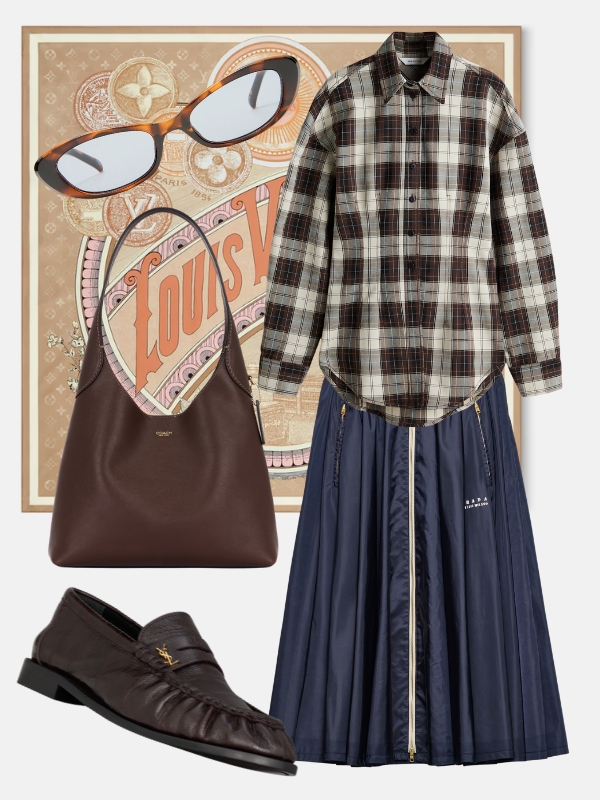 Preppy trend dobija novu, cozy dimenziju uz The Frankie Shop oversized jaknu i boxy polo džemper iz Massimo Duttija. Mango plisirana suknja vraća školsku uniformu u igru, dok Chloé Paddington torba dolazi u reizdanju kultnog modela iz 2000-ih – torbe koja je u svoje vreme redefinisala IT-bag status. Grandpa-style sokne sa romboidima donose retro šarm, a YSL mokasine zaokružuju priču. Obavezni dodatak? Dioptrijski okviri – ključni aksesoar ove jeseni.