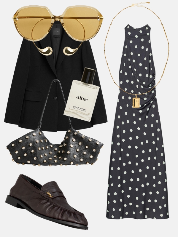 Zara haljina na tufne i Altuzarra torba sa krupnim cirkonima donose igru grafičkih elemenata – tufne su u centru pažnje ovog stajlinga. Massimo Dutti crni sako daje poslovni ton, savršen za brzi skok na sastanak. Zlatni detalji – Bottega Veneta naočare i Hermina ogrlica – unose luksuzan sjaj, dok čokoladno braon Saint Laurent mokasine ublažavaju formalnost i ostavljaju utisak nonšalantnosti.