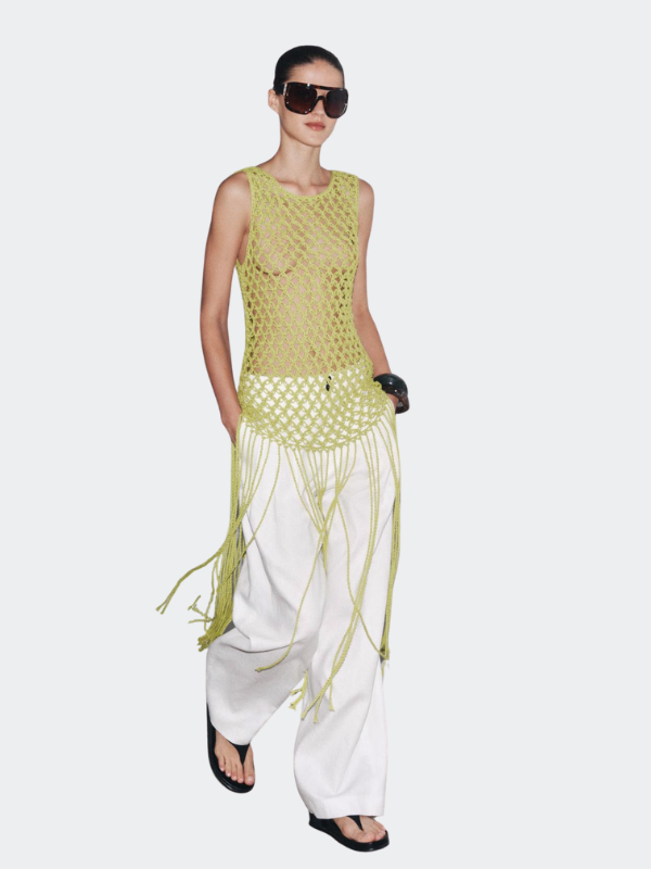 Krupno pletenje i dugačke rese čine ovaj top statement komadom. Igra prozirnosti daje mu dozu provokacije, a lako se uklapa uz minimalistički veš, lanene pantalone ili svedenu pencil suknju. Ne morate da budete fan boho stila – ovaj top će se prilagoditi različitim estetikama i zbog toga je naš favorit broj jedan.