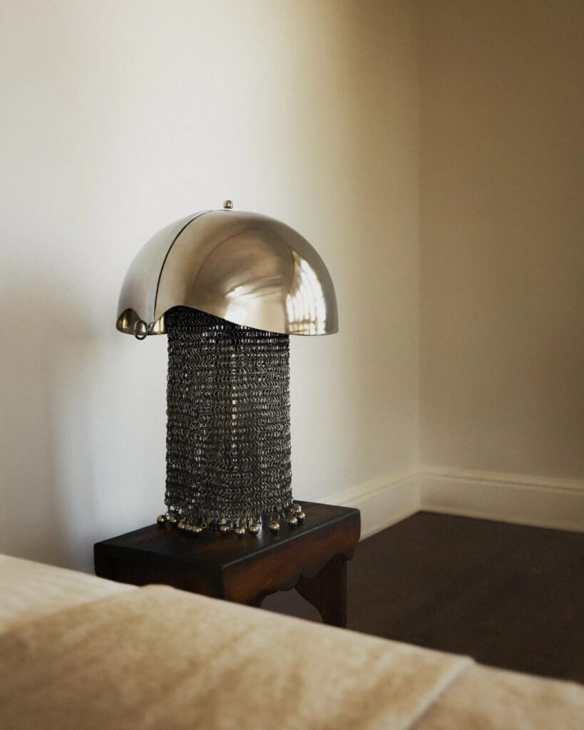 Srednjovekovna estetika nije rezervisana samo za enterijer. Dizajneri studija SO-IL obložili su galeriju Kukje u Seulu ručno izrađenim chainmailom, stvarajući veliku, grubu strukturu koja odražava duh “urbane gotike”. Iako je materijal prvobitno dizajniran za oklop, danas se koristi za suptilno razdvajanje prostora ili kao svetlosni akcenat, kao što je Cyanea Table Lamp koju je kreirala Georgia Somary. Njena lampa kombinuje čelik sa delikatnim svetlosnim efektima, pružajući toplinu kojoj bi se malo ko nadao od hladnog metala.