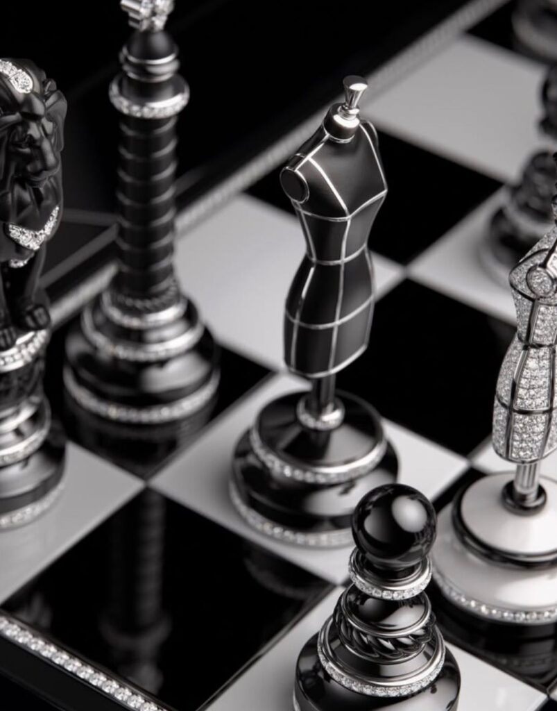 Centralni deo kolekcije, nazvan jednostavno “The Chessboard” (Šahovska tabla), redefiniše pojam luksuza. Igralište za ovu partiju snova počiva na bazi od misterioznog crnog opsidijana, dok su 64 polja izrađena u prepoznatljivom Chanelovom crno-belom kodu, od keramike visoke otpornosti. Okvir je uokviren nizom od 516 brilijanata, a minuciozni rad na njegovoj izradi zahtevao je čak 900 sati majstorskog postavljanja dragulja – posvećenost detaljima dostojna ateljea visoke mode.