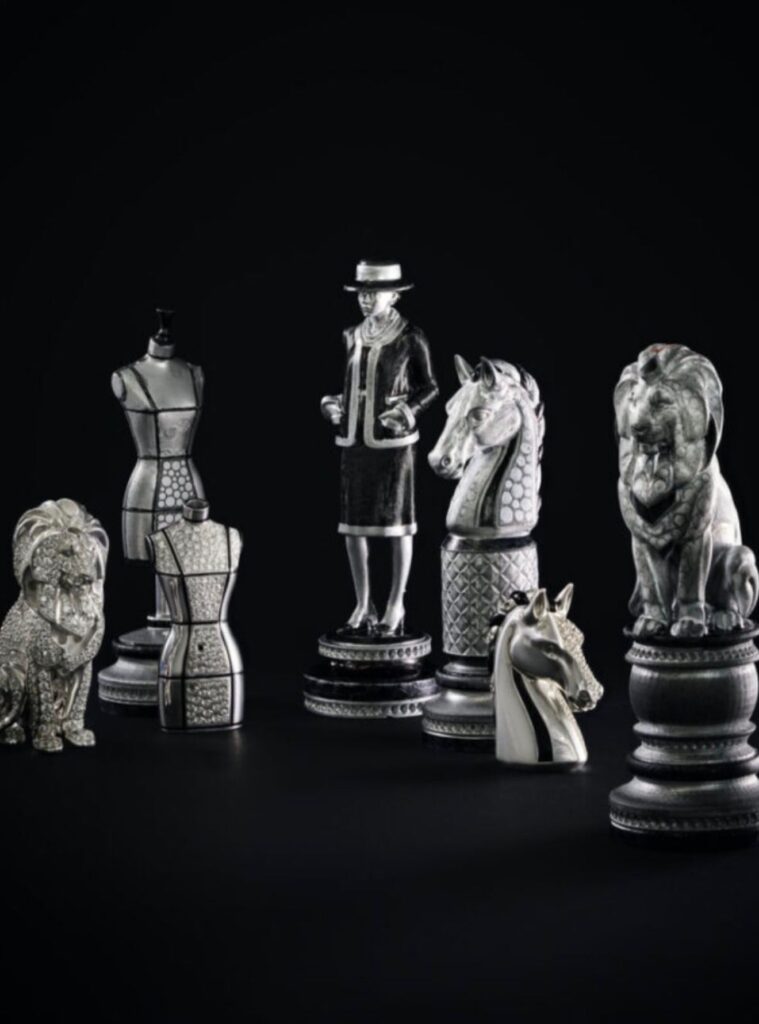 Svaka od 32 figure je zapravo minijaturna haute couture skulptura, inspirisana ikoničnim simbolima kuće Šanel. Kraljevi su lavovi, horoskopski znak same Koko Šanel, topovi su replike stuba sa pariskog trga Vandom, dok su lovci stilizovane krojačke biste, kao omaž preciznosti i umeću iz Chanelovih ateljea. Crne figure izrađene su od keramike sa detaljima od belog zlata, dok bele figure, u potpunosti od belog zlata i prekrivene dijamantima, stvaraju glamurozan kontrast.