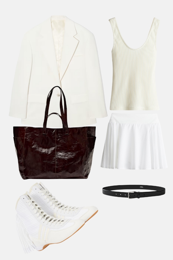 Sporty and spicey. Beli look razbijen je tamnim kožnim aksesoarima a duboke patike inspirisane bokserskom obućom i velika pletena torba daju edgy notu, spajajući ležernost i luksuz. Transparentni bela majica ne mora da otkriva vašu privatnost, dovoljno je da pronađete dobar sportski top koji ćete nositi ispod. Ukoliko želite da unesete još malo seksipila, pogledajte Zara donji veš, idealan za ovu nonšalantnu kombinaciju.