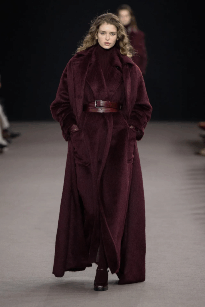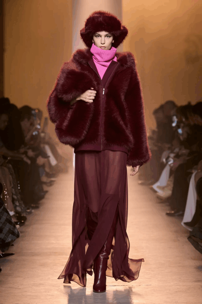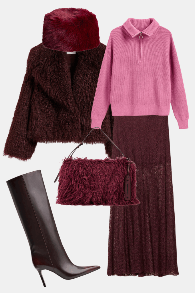 Pomalo koketno, mladalački i efektno – ovaj Elie Saab look dobija savremenu verziju kroz pristupačne komade. Bordo ostaje glavna nit, ali se poigrava teksturama i nijansama koje daju dinamiku. Reserved bunda donosi mekoću i volumen, dok čipkana maksi suknja iz Stradivariusa unosi dozu romantike. Visoke čizme iz Bershke balansiraju ženstvene elemente. Za kraj, krznena torba Karl Lagerfeld i ružičasti džemper razbijaju monohromatski utisak i dodaju dozu svežine – baš koliko treba da look ostane nosiv.