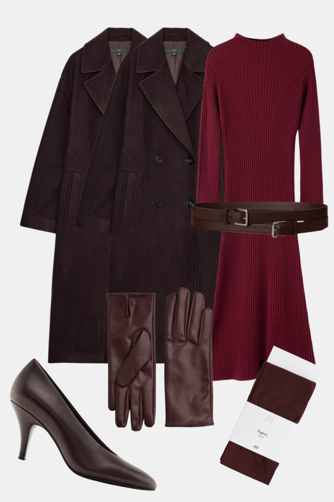 Neprevaziđena klasika – bordo na bordo ovde dobija novu dimenziju. Iako može da deluje dramatično, u ovoj interpretaciji izgleda čisto, elegantno i vrlo promišljeno. Slojevitost je ključ: dva kaputa stvaraju vizuelnu dubinu, dok pletena haljina unosi mekoću i balans. Ako želite jednostavniju verziju, dugački kardigan preko haljine daje isti efekat. Massimo Dutti salonke, H&M rukavice i bordo hulahopke zaokružuju look koji deluje luksuzno, ali nosivo – idealno za dane kada želite da izgledate snažno, a nenametljivo.
