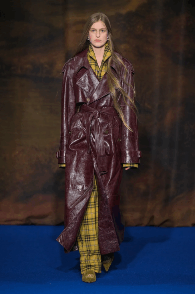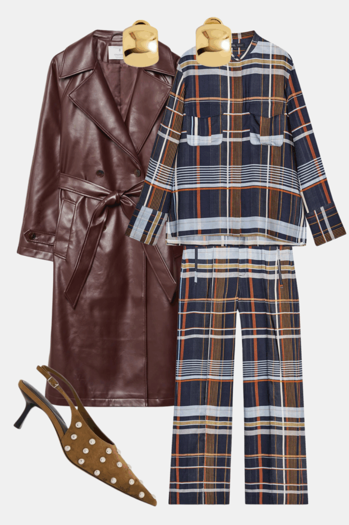Bordo efekat ovde dobija mlađu, razigraniju notu. Burberry nam daje savršenu inspiraciju za to. Karirani komplet iz Zare, ispod “kožnog” Stradivarius mantila unosi dozu ležernosti i savremeni twist. Upravo taj miks čini kombinaciju zanimljivom: klasične forme susreću se sa urbanim izrazom. Detalji su ključni – nakit podiže ceo look, dok maslinasto zelene cipele razbijaju bordo paletu i daju neočekivan, ali vrlo efektan kontrast.