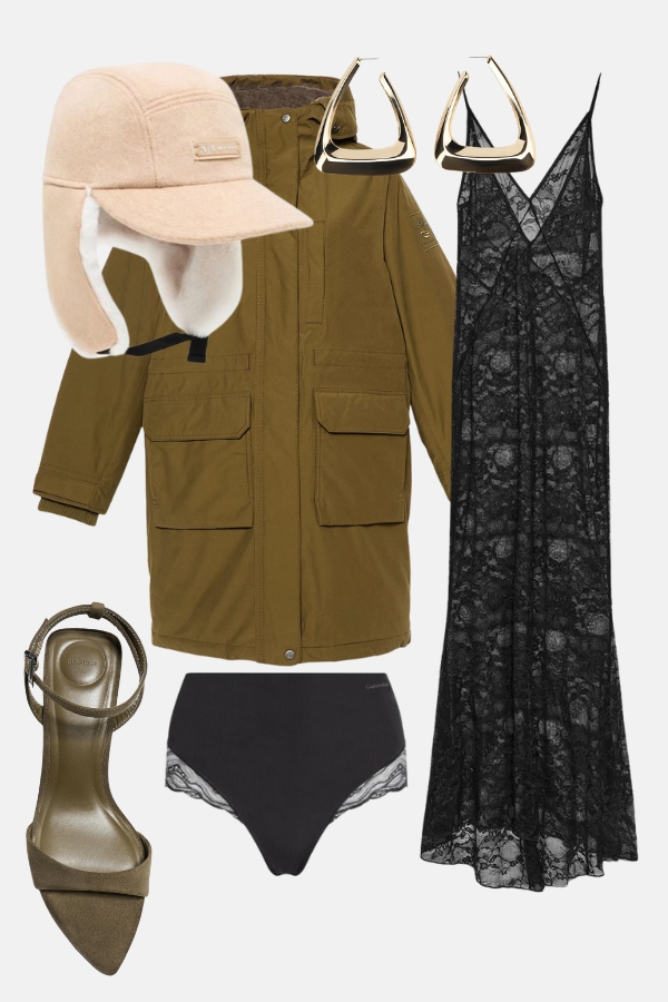 Ovaj look je omaž Dsquared2 revijskom izlazu: seksipil susreće planinski šik. Predimenzionirana Timberland jakna u maslinasto zelenoj boji u kontrastu je senzualnoj čipkastoj Zara haljini i krznenoj Armani Exchange šubari. Calvin Klein donji veš i zlatne P.S. Fashion alke dodaju party detalj, dok Bershka maslinaste sandale zaokružuju edgy balans. Look rezervisan za avanturiste.