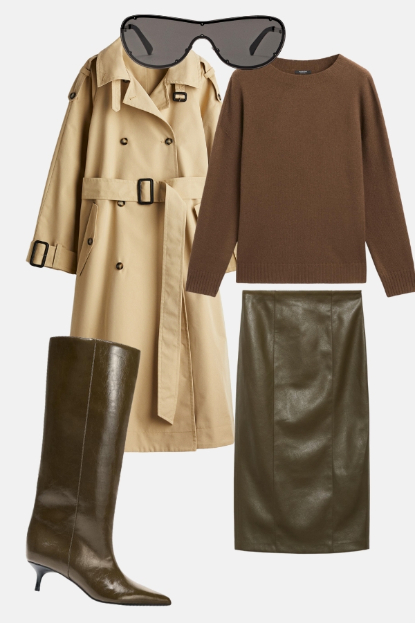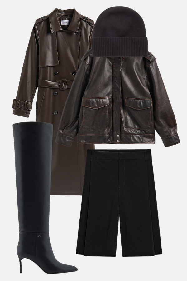 Ovaj Sportmax look za jesen/zimu 2025 spaja moćne slojeve kože i zemljane tonove u high street verziji. Reserved braon trench i kožna jakna donose pomalo dramatičan izgled, dok Zara crne bermude umiruju efekat i čine kombinaciju nosivom. Armani Exchange čizme iznad kolena unose seksipil, a Cos beanie, na prvi pogled neočekivan, daje autfitu opuštenu notu koja ovaj izgled čini neusiljenim.