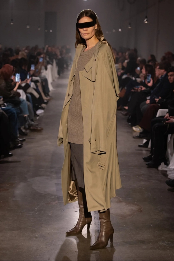 Ovaj MM6 Maison Margiela look oživljava DNK Martina Margiele kroz mistične proporcije i neutralne, gotovo zamuljane tonove. Predimenzionirani mantil, gotovo par brojeva veći, nosi prepoznatljiv Margiela efekat, dok jednostavan džemper (Massimo Dutti) i pencil suknja pokazuju kako najosnovniji komadi, uklopljeni na pravi način, postaju avangardni. Massimo Dutti naočare za sunce i Zara maslinasto zelene čizme zaokružuju autfit neočekivanom dozom karaktera.