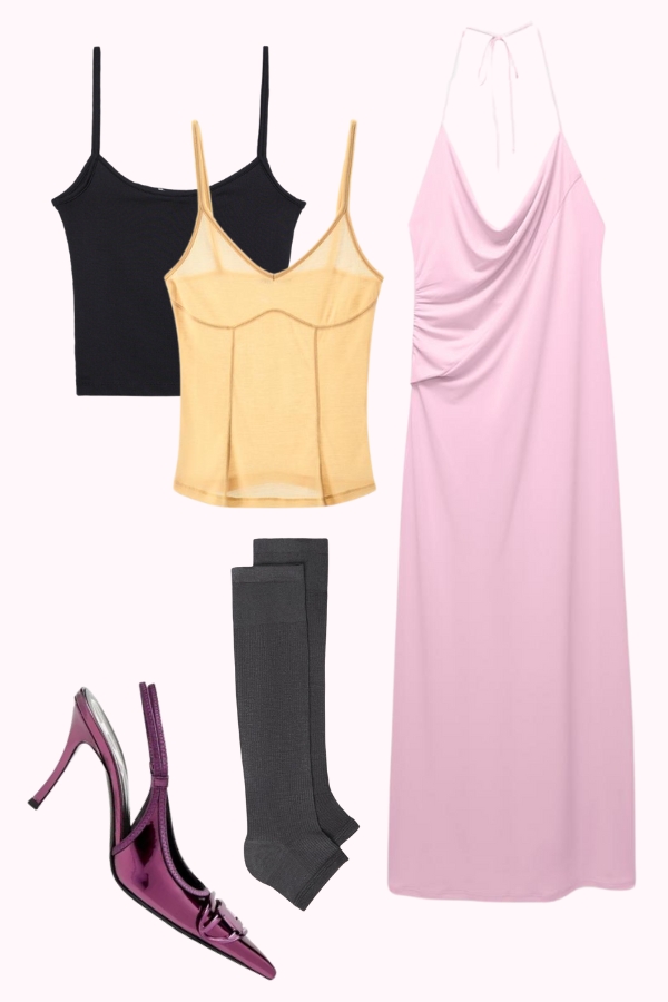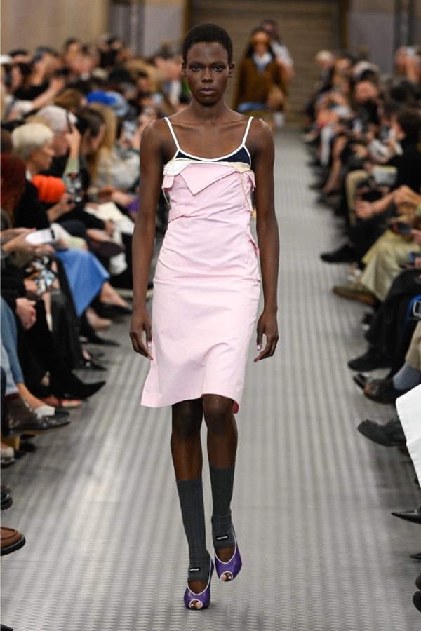 Miu Miu kao i uvek pomera granice – roze slip haljina dobija grunge obrt uz slojeve, asimetrične detalje i čarape uz salonke. Efekat je pomalo haotičan, ali epitom pravog coolnessa. Pronašli smo Pull&Bear haljinu na bretele koju možete da vežete na neke inovativne načine, noseći ih preko topova sa tankim bretelama.