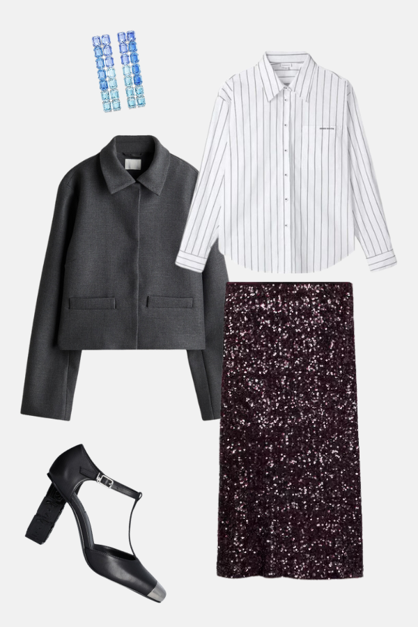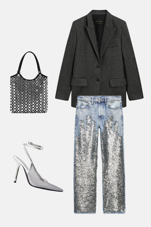 Stella nam je pokazala kako da unesemo malo sjaja u naše dnevne kombinacije. Klasične farmerke ukrašene srebrnim šljokicama deluju cool i edgy, više nego što smo očekivali da šljokice mogu da budu. Uz predimenzionirani sako, široke naramenice i srebrne aksesoare, ovaj look može da pređe iz dnevne u večernju varijantu vrlo lako. Tokom dana odaberite sivu široku rolku a za veče je zamenite korsetom, bodijem ili topom od transparentnog materijala.