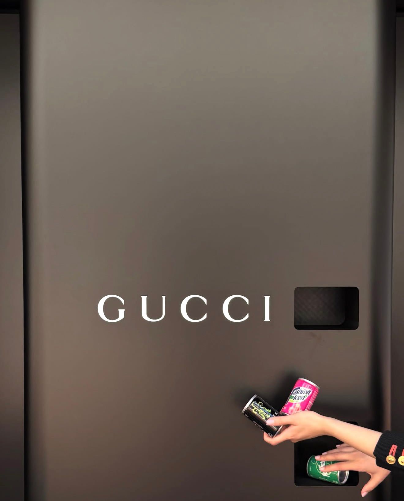 To je trenutak u kome moda prestaje da bude objekat i postaje iskustvo. Vending mašina, simbol svakodnevice i potrošnje, ovde je reinterpretirana kao umetnički artefakt — crna, monolitna, gotovo arhitektonska. Ona ne poziva na kupovinu iz potrebe, već iz radoznalosti. Šta zapravo kupujemo kada kupujemo Gucci limenku? Piće, suvenir ili deo narativa?