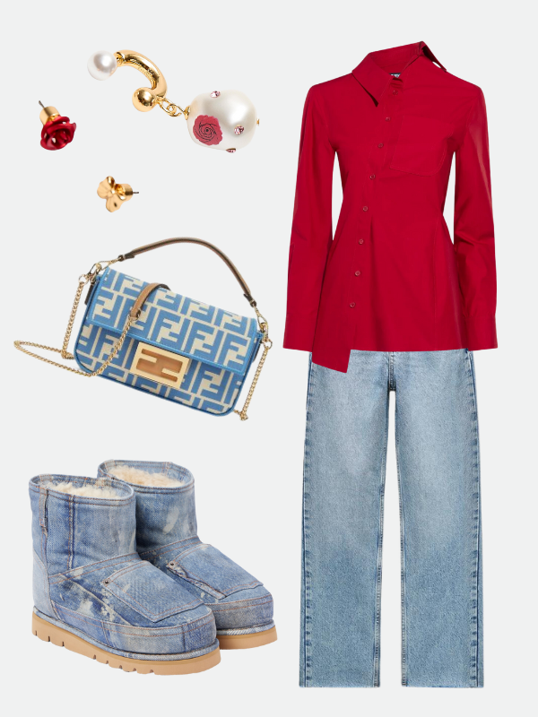 Crvena Jacquemus košulja kombinuje se lepo uz denim i baby plave komade. Zarine farmerke iznad gležnja slagaće se perfektno uz Acne Studios zimske čizme sa teksas printom. Na to dodajte ovu bombastičnu Fendi torbu sa zlatnim lancem i plavim logoom kako biste koloristički izbalansirali ovaj look. Stradivarius minđuše sa crvenim ružicama su tu da upotpune quirky styling do kraja. Samo za hrabre!