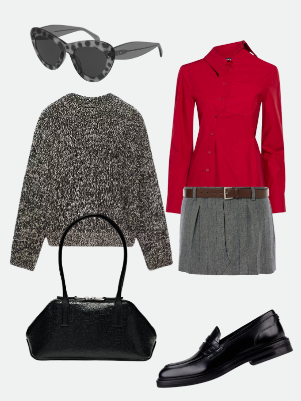 Inspirisane stilom školarki, odabrali smo mini Prada suknju i mokasine za treći look. Mango džemper ogrnite i zavežite oko vrata za layering efekat, ili ga odenite preko košulje toliko da proviri samo crvena kragna. Sjajna Massimo Dutti torba od kože doprinosi igri tekstura, a Alaia naočare su tu za dane kada nam se ne nosi šminka.