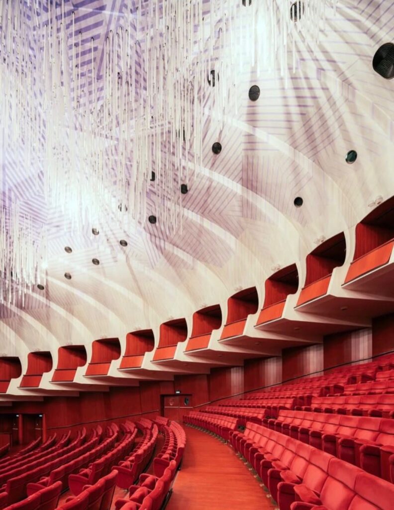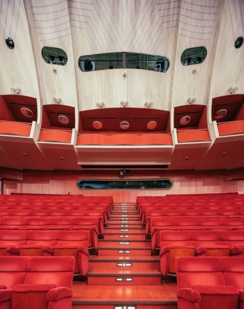 Glavna sala ima eliptičan oblik, što nije samo estetski izbor, već i akustički — omogućava savršenu distribuciju zvuka i vidljivost iz gotovo svakog ugla.