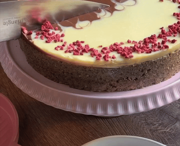 3. Onda napraviti ganaš, za njega zagrejati slatku pavlaku, vrelu je preliti preko mlečne čokolade i ostaviti da odstoji par minuta. Dobro promešati i preliti preko pola torte. Isto uraditi sa belom čokoladom i preostalom slatkom pavlakom.