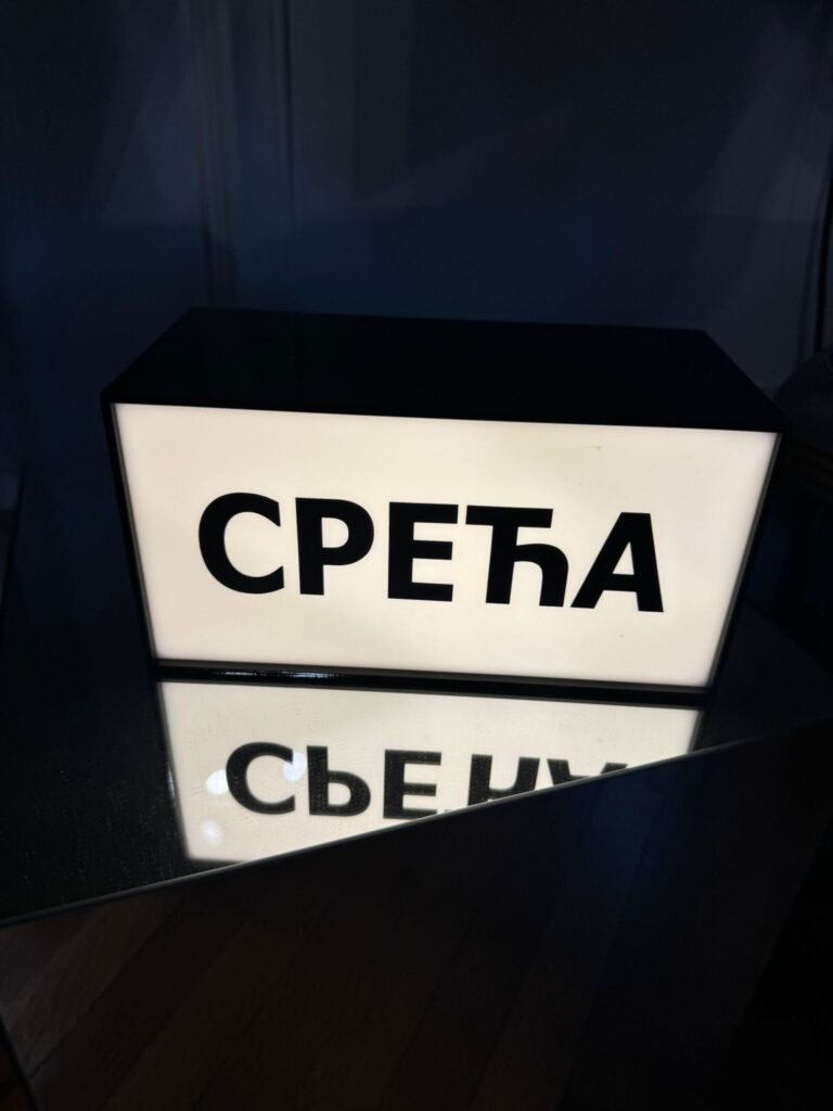 U kancelariji, box sa “DOĐE MI DA ODEM” ili “IN A PLACE LIKE THIS NO ONE IS INNOCENT” stoji kao suptilna poruka na stolu. To su fraze koje kombinuju etiku i ironiju, dovoljno elegantne da ostanu nenametljive, a dovoljno jasne da se poruka razume.