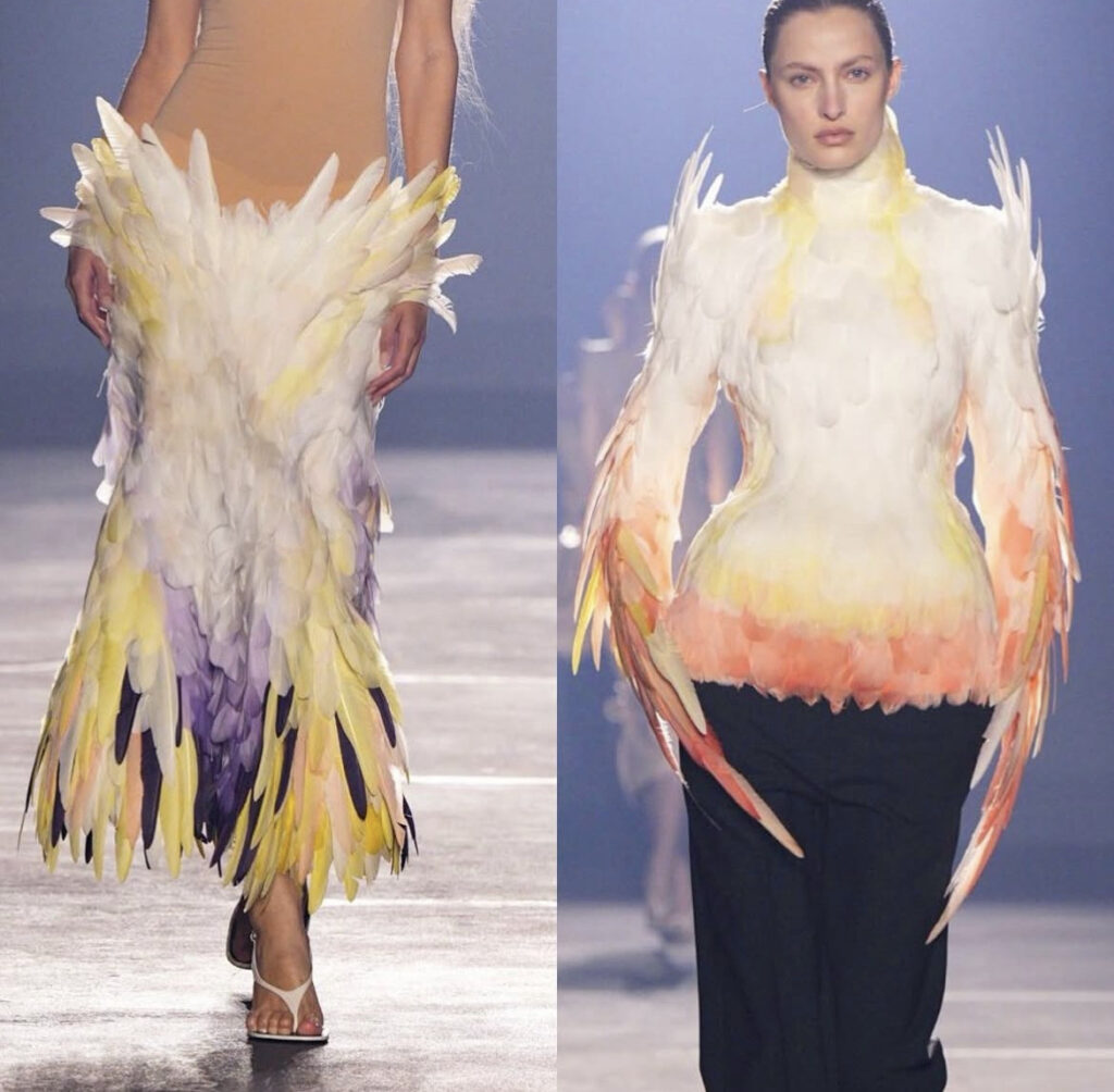 Materijali su odigrali ključnu ulogu. PVC, lateks i patentna koža komunicirali su sa snagom i rigidnošću, dok su til i marabou perje unosili lakoću i prozračnost. Transparentne površine nisu bile tek provokacija, već način da se telo stavi u dijalog sa krojem i tkaninom.