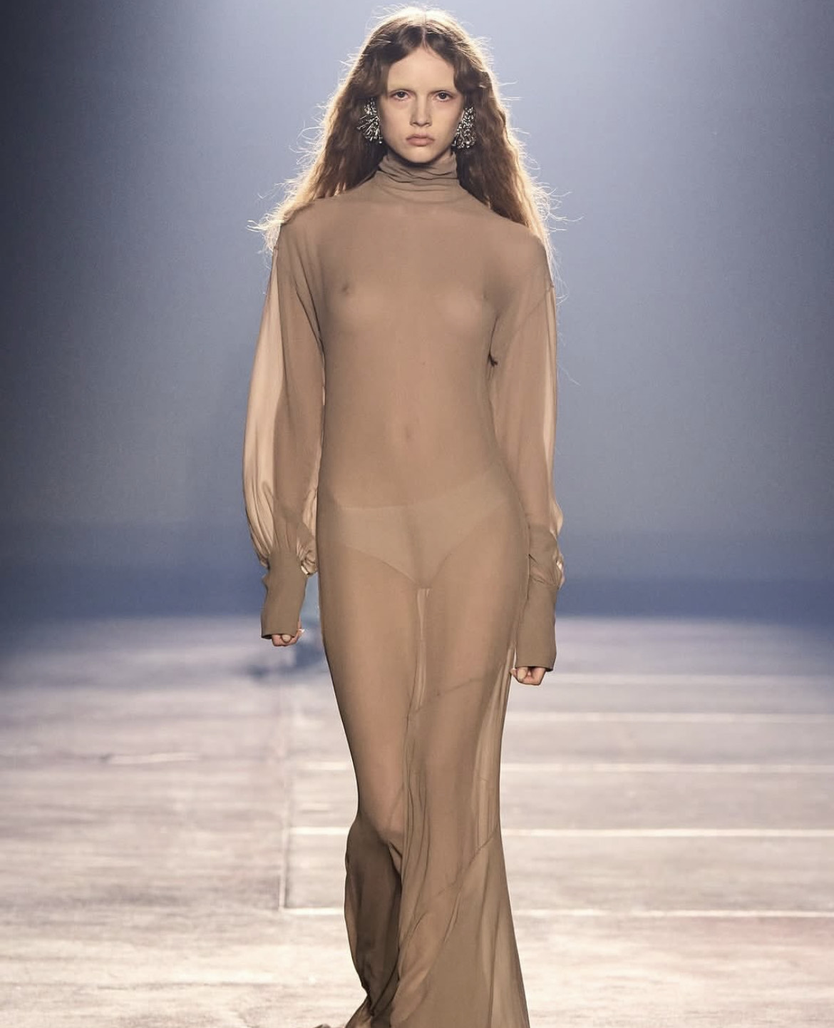 Revija je održana u brutalističkom prostoru garaže, sa betonskim zidovima koji su kontrastno uokvirili kolekciju. Takva scenografija naglasila je dramski ton brenda, ali u obliku kontrolisanog spektakla. Freitas je oslonio priču na kodove kuće – ekstremne siluete, naglašena ramena, sužen struk, voluminozne kukove – ali ih je pročistio i oblikovao kroz disciplinu i promišljenu dramaturgiju.