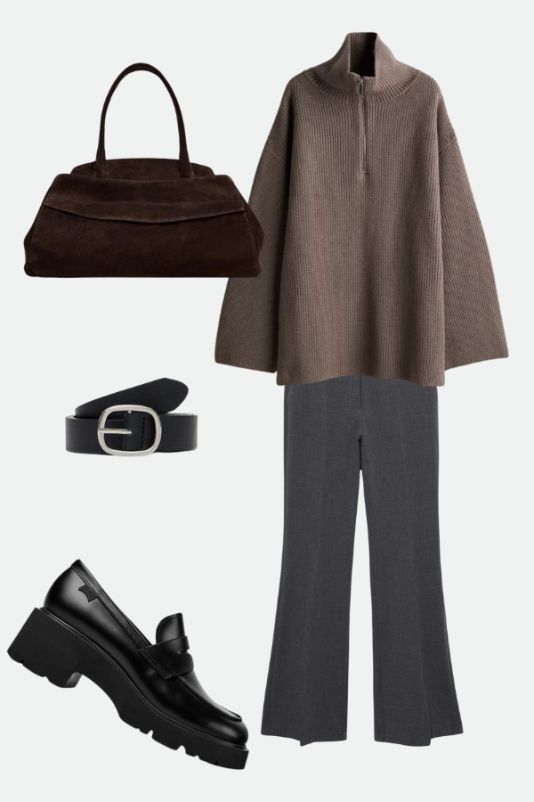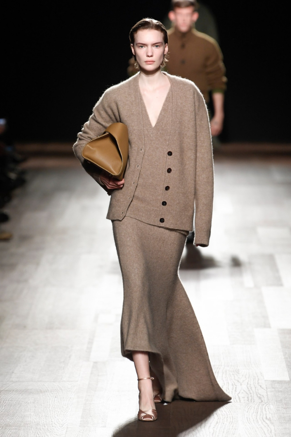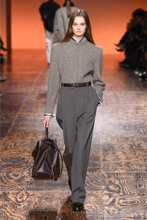 Nekima su androgene forme mnogo prijatnije. Zato biramo ovaj Bottega Veneta autfit za fanove oštrih formi i klasičnih krojeva. Paleta boja ide od peska, sivih, do duboke braon, a za kraj upotpunite izgled kabastim crnim mokasinama visokog sjaja. Za pumpkin spice latte sa prijateljima ili put na planinu, ovu kombinaciju možete da nosite u više različitih prilika.