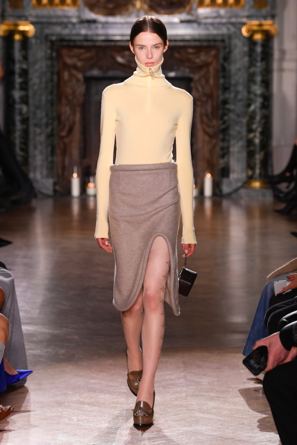 Victoria Beckham je sinonim za balans ženstvenosti i muških krojeva. Uska rolka i pencil suknja sa dubokim šlicem, kombinovani su sa mokasinama na štiklu. Uske forme i glomazne cipele su pametan kontrast, a nama se čini da se i dalje vodimo trendom “pogrešnih cipela“. Expect the unexpected.