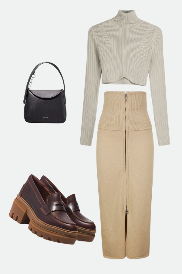 BERSHKA top, SPORTMAX suknja, CALVIN KLEIN torbica, TIMBERLAND mokasine