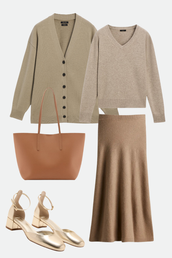 MASSIMO DUTTI kardigan, MASSIMO DUTTI džemper, H&M suknja, MANGO torba, MANGO cipele