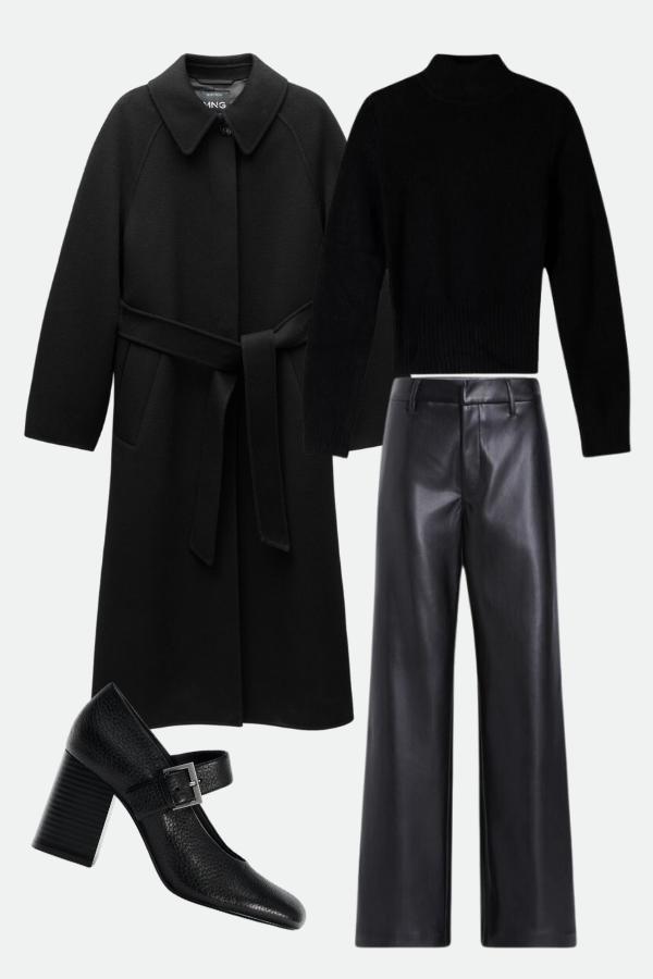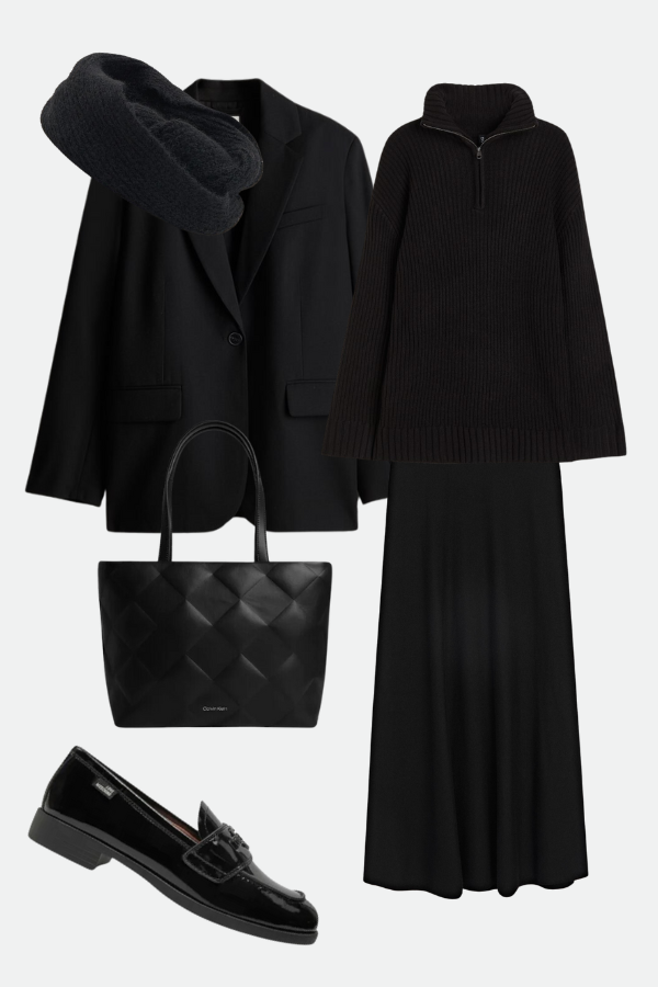 Slojevito i samo slojevito! Crna je šik kako god da okrenete. Duga crna Massimo Dutti suknja zajedno sa predimenzioniranim crnim sakoom deluje nonšalantno i luksuzno. Uz to dodajte grejač oko vrata, mokasine od sjajne kože, praktičnu crnu torbu i spremne ste za dan. Što se tiče džempera, ukoliko niste na zimogrožljivoj strani, odaberite slim fit crnu rolku, nešto kraću kako bi virio tračak vaše kože između ovih crnih površina. Trik je u dužinama!