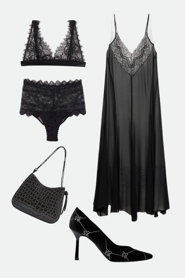 INTIMISSIMI brushalter, INTIMISSIMI gaćice, ZARA negliže, MANGO torbica, HUGO cipele