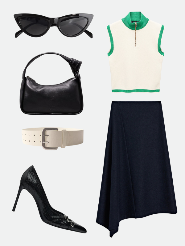 Ove nedelje stilizujemo za vas tanki pleteni top. Oivičen svežom, jarko zelenom bojom, odaje blagi tennis core vibe. Trend sportskih komada traje već godinama, ali sada sa pojavom tennis corea, ulazimo još dublje u old money estetiku. Mnogi brendovi su lansirali svoje kolekcije inspirisani tenisom – Miu Miu Tennis Club, Gucci u saradnji sa Adidasom, kao i oduvek prisutni Lacoste.